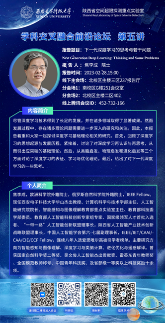 pp电子游戏平台官网焦李成院士受陕西省空间超限探测重点实验室邀请,将于2023年2月28日(周二)下午在pp电子游戏平台官网北校区主楼三区237报告厅开展题为《下一代深度学习的思考与若干问题》的讲座报告。欢迎广大教师前来聆听交流!