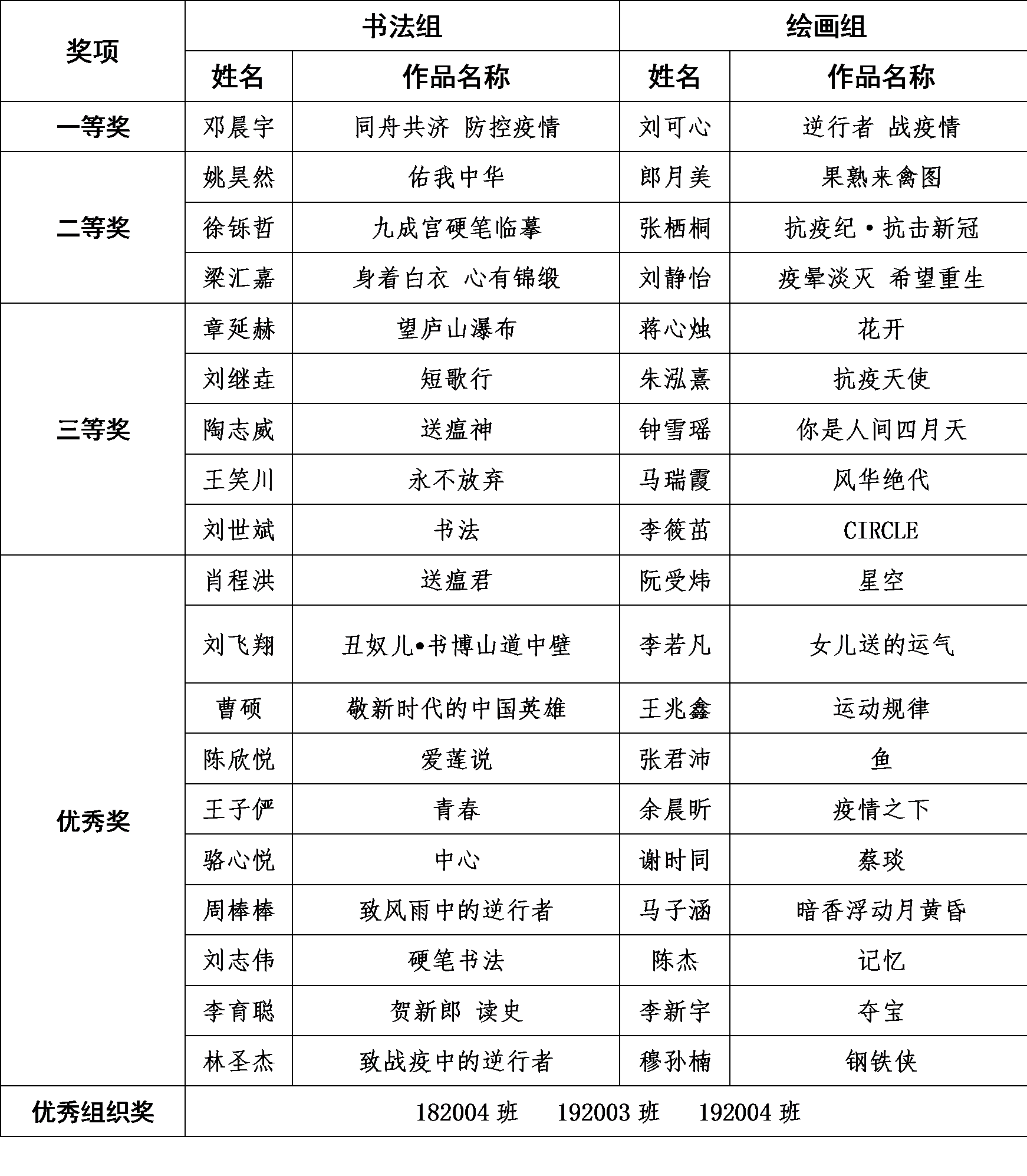此次活动在4月30日正式开始,面向pp电子游戏平台官网全体本科生公开征集书法和绘画主题作品,得到了同学们的热烈响应,通知当晚便有同学提交了作品。在为期两周的创作时间内,智能学子们行文如流水,落笔如云烟,一幅幅构思精巧,创作精良的作品呈现出来。本次活动共计收到学生作品50余件,经过线上投票与评委线下打分,最终由邓晨宇创作的书法作品《同舟共济 防控疫情》摘得书法组一等奖,绘画组一等奖则由刘可心创作的《逆行者 战疫情》获得,182004等三个班级荣获“最佳组织奖”。