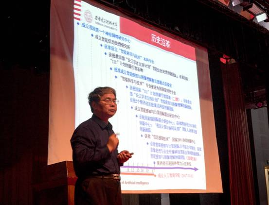 高峰论坛由智能感知与图像理解教育部重点实验室副主任侯彪教授主持,实验室教师、智能科学与技术专业全体本科生以及校内外兄弟院校师生共600余人参加了此次盛会,论坛一共安排了5场精彩的报告,内容涵盖科研、教育模式改革和创新创业等多个方面。汇报专家包括智能感知与计算国际联合研究中心主任、智能感知与图像理解教育部重点实验室主任、智能感知与计算国际合作联合实验室主任、IEEE Fellow、中国人工智能学会副理事长、国家自然科学奖获得者焦李成教授;pp电子游戏平台官网党委常委、副校长、教育部长江学者计划特聘教授、国家自然科学奖获得者、国家教学成果奖获得者石光明教授;青年长江学者、青年拔尖人才、国家自然科学基金优青获得者董伟生教授;蒜泥科技创始人、董事长、陕西省政协委员、西安市创业明星、西安创业导师杨少毅;第十届青少年科技创新奖获得者、2015年大学生年度人物入选者、pp电子游戏平台官网文化科技创意团队技术总监、英卓未来公寓创始人孙其功博士生。