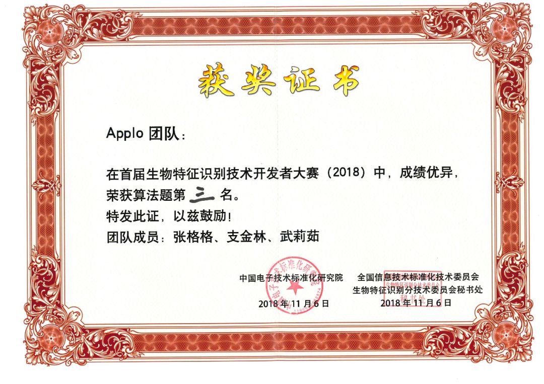 据悉,大赛历时两个多月,吸引了174支队伍,共计320人参加,算法题通过AUC指标对算法的性能进行排名,初赛选取前20进入复赛,Applo团队在初赛阶段就以第5名的成绩,成功入围复赛,复赛阶段,除了AUC指标的算法排名,还需要提交依据GB/T26237.5-2014《信息技术 生物特征识别数据交换格式 第5部分:人脸图像数据》标准生成“人脸数据记录单元”用于标准符合性测试,在通过标准符合性测试的团队中,取前3入围决赛,参与现场答辩,以复赛排名70%和答辩30%的比例进行最终成绩的加权,经过激烈的角逐,pp电子游戏平台官网硕士研究生张格格所在队伍Applo取得了大赛季军,颁奖典礼在11月6日举办的全国信标委生物特征识别分委会(TC28/SC37)2018年全会上作为会议上的一个重要环节进行,与会领导为西电智能学子颁发获奖证书。
