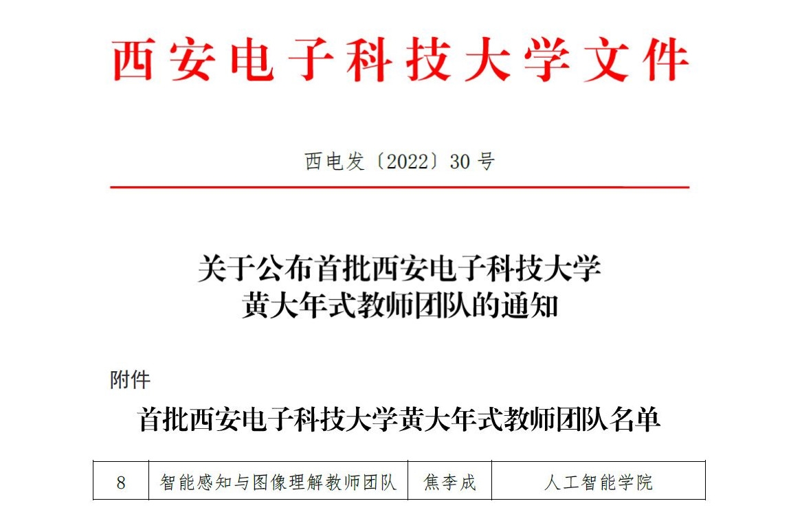 近日,学校印发《关于公布首批pp电子游戏平台官网黄大年式教师团队的通知》(西电发〔2022〕30号),认定全校8个教师团队为首批pp电子游戏平台官网黄大年式教师团队,pp电子游戏平台官网焦李成院士带领的“智能感知与图像理解教师团队”入选。