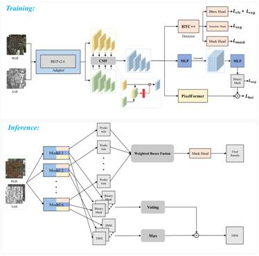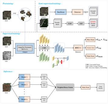 亚军方案:队伍提出一种三阶段训练框架以及一种两阶段测试增强流程。其训练框架由预训练、监督训练和半监督训练组成。首先通过在裁剪出来的目标实例上进行迁移学习,将自然图像中的先验知识适应至本赛题中的遥感建筑物细粒度感知上,选取BEiTv2模型作为特征提取网络。其次,在监督训练阶段引入一种自适应器来增强网络的表征能力,同时提出一种跨模态融合组件来有效利用SAR数据中的信息进行辅助训练,选取HTC++作为检测器网络。在半监督训练阶段中提出全局平均滤波以及类内自适应阈值法对原始伪标签进行去噪,提高了模型的泛化能力。队伍提出的测试增强处理流程在对多种训练模型的初始预测结果进行目标框级的加权融合,得到定位更准确的前景框后,使用检测器的掩码头对最终结果进行分割。该方案突破了细粒度目标识别类内差异显著以及多源信息融合低效等技术难点,实现了跨域场景下建筑物提取的高效性能。