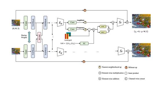 冠军方案:队伍采用SwinIR-LTE为基线模型,同时使用了SwinIR、RDN-LTE、LIIF-EDSR、LIIF-RDN等多个模型。队伍使用了CutBlur、Blend、RGB permute、Mixup、CutMix和CutMixup等6种方法进行数据增强。此外,队伍还提出了融合SSIM中结构纬度计算的SL1loss来替换L1loss,显著提高了SSIM指标的分数。在模型融合阶段,队伍提出了一种逆差异化动态权重融合方法,实现了减小坏值点影响的目的。队伍方案在取得了31.23(PSNR)与0.87(SSIM)的得分,明显优于其他参赛队伍得分。该方案突破了图像多维度综合评价以及模型高效动态融合等技术难点,解决了低分辨率图像恢复中关键细节信息较难恢复问题。