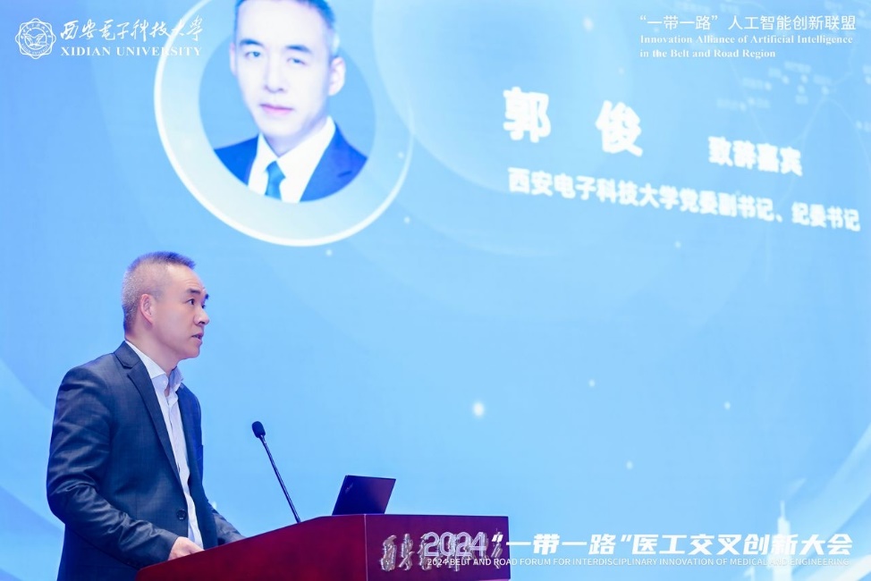 上午9点,在pp电子游戏平台官网执行院长侯彪教授的主持下,会议开始。开幕式上,pp电子游戏平台官网党委副书记、纪委书记郭俊致辞,祝贺大会顺利举办,并对出席论坛的领导、专家学者致以热烈的欢迎和衷心的感谢。郭俊表示,pp电子游戏平台官网作为“‘一带一路’人工智能创新联盟”的发起单位,持续主办“一带一路”系列会议,推动人才培养供给侧与区域产业发展需求侧的深度耦合,促进学术交流、人才培养、科学研究、政策研究、社会服务等多方面区域合作与发展。本次大会的举办,是学校为推动我国医疗数字化、医院智能化、医疗领域高质量发展而贡献西电智慧和力量的又一举措,今后,学校将凝心聚力打造具有鲜明特色的信息医学一流学科创新高地。