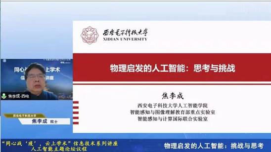 2022年1月1日,欧洲科学院外籍院士、俄罗斯自然科学院外籍院士、IEEE/IET/CAAI/CCF/CIE/CAA Fellow、pp电子游戏平台官网计算机科学与技术学部主任、人工智能研究院院长、华山学者杰出教授焦李成受邀参加新年第一课——“同心战疫云上学术”信息技术系列讲座,并做了题为“物理气启发的人工智能:挑战与思考”的报告。