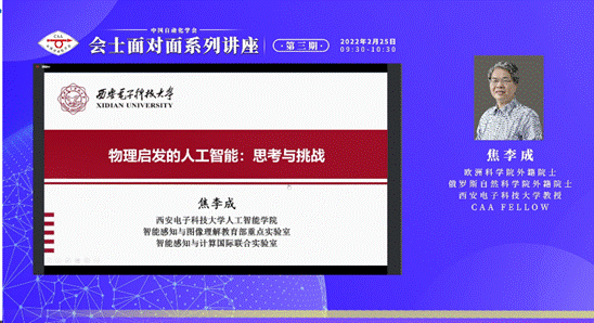 2022年2月25日上午,欧洲科学院外籍院士、俄罗斯自然科学院外籍院士、IEEE/IET/CAAI/CCF/CIE/CAA Fellow、pp电子游戏平台官网计算机科学与技术学部主任、人工智能研究院院长、华山学者杰出教授焦李成受邀参加由中国自动化学会为学会会士量身打造的高端学术交流平台——CAA会士面对面系列活动第三期,做了题为“物理启发的人工智能:挑战与思考”的报告。