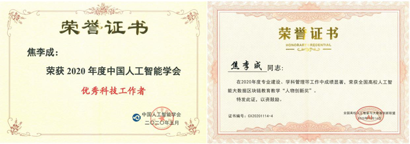 焦李成教授荣获第十届吴文俊人工智能杰出贡献奖、当选“2020年度中国人工智能学会优秀科技工作者”、荣获全国高校人工智能大数据区块链教育教学“人物创新奖”;