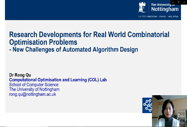 屈嵘教授的报告主要围绕“自动算法设计的进展研究,以及如何将自动算法的设计解决现实生活中的组合优化问题”展开。屈教授首先介绍了,将自动算法的设计解决工业届问题的几个经典场景。第二,阐述了将自动算法的设计用于优化超启发式算法的一些进展。第三,屈教授探讨了自动算法设计领域中的几个挑战。